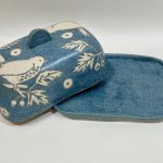 A stoneware butter dish with Wren design. Approximately 16cm long, 10cm wide and 6.5cm high. Microwave and dishwasher safe but we would recommend hand washing to preserve the life of this handmade item. This image is illustrative because each item produced is unique and colour variations occur.