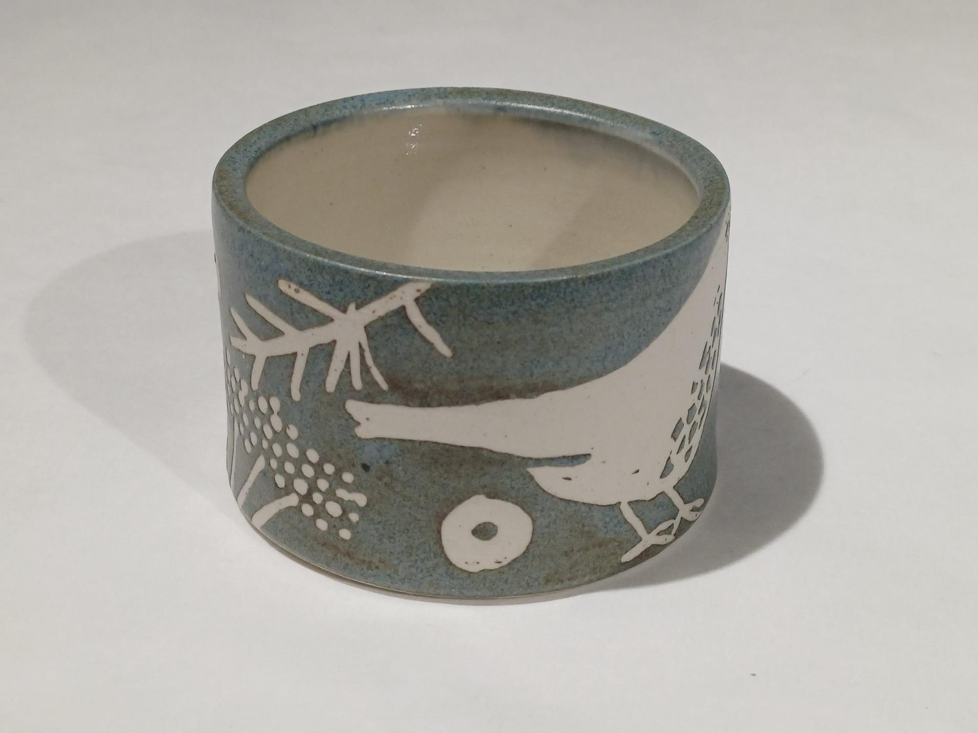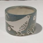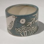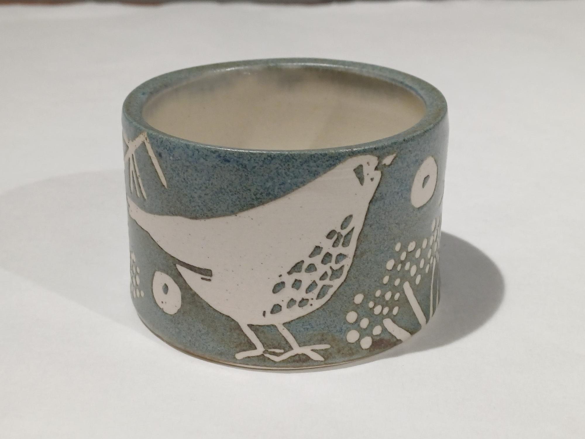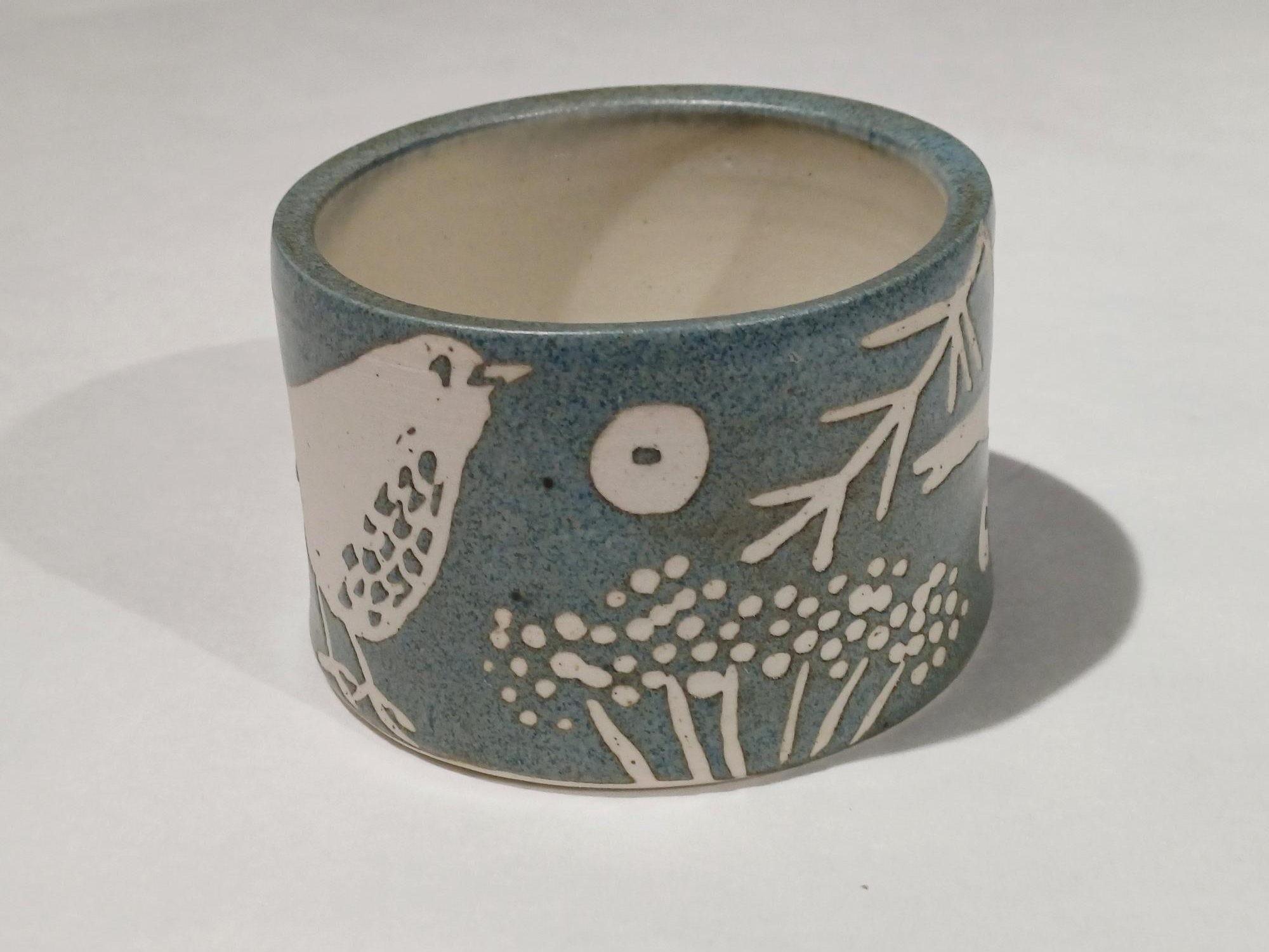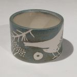A stoneware small pot with thrush design. Approximately 7.5cm wide, 5cm high. This image is illustrative because each item produced is unique and colour variations occur, may face left or right.