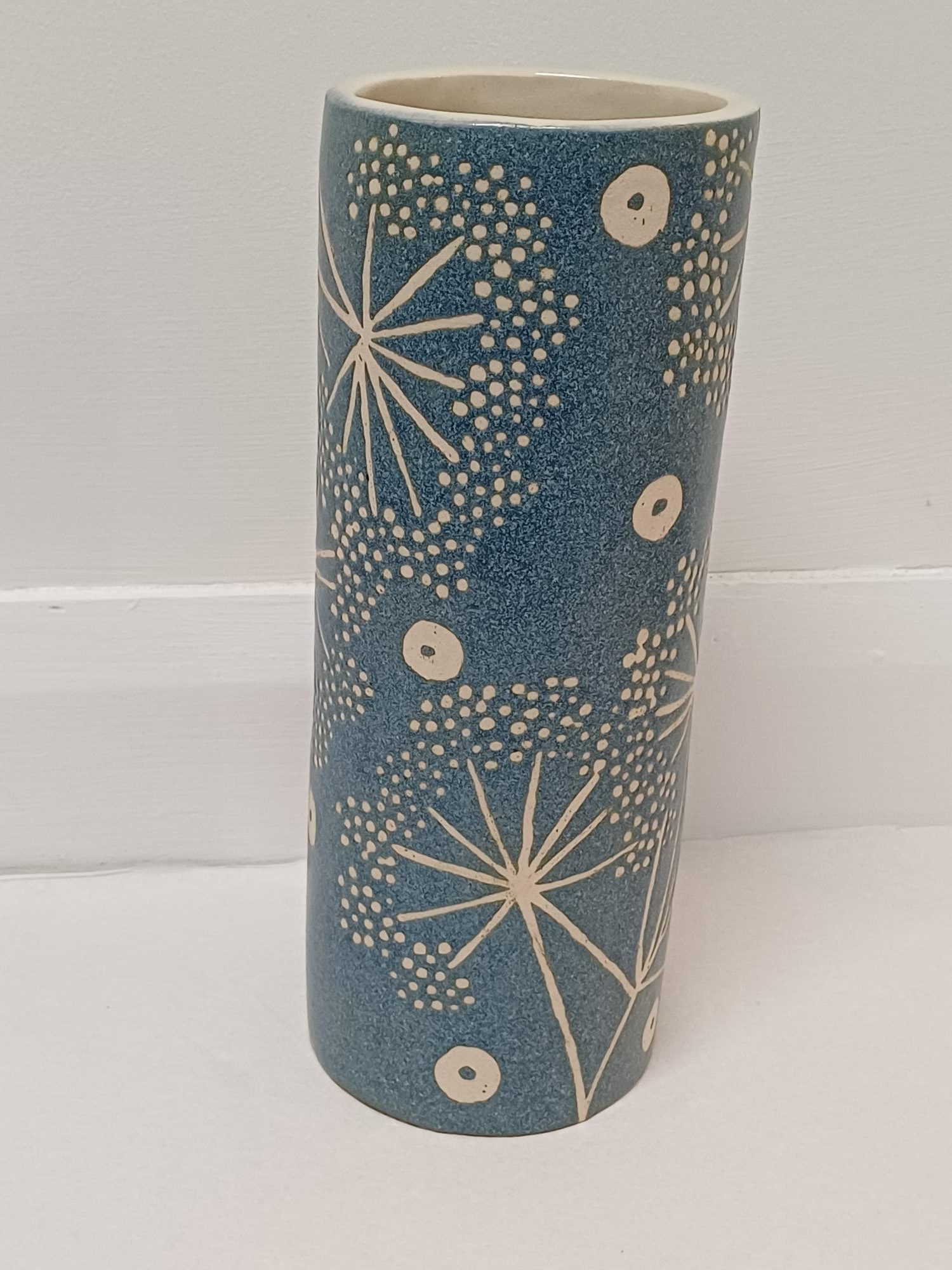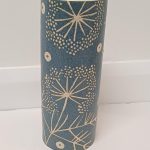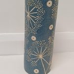 A blue stoneware tall vase with seedhead design. Approximately 25cm high, 9.5cm wide. This image is illustrative because each item produced is unique and colour variations occur.