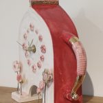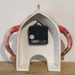 A beautifully handmade ceramic clock. Decorated with shades of pink and gold lustre details and flowers. The measurements are approximately: Height 18.5cm, Width 20cm at its widest point, and Depth 7.5cm. Powered by one AA battery.