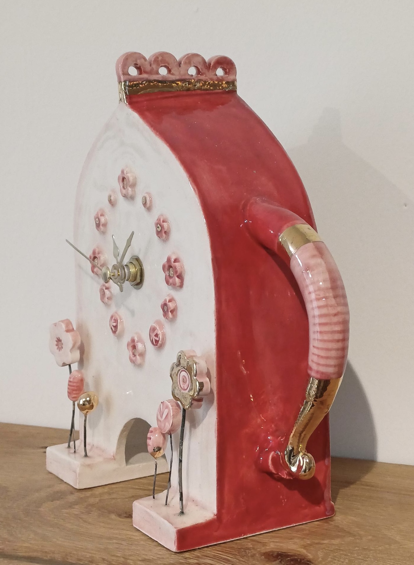 Ceramic clock with pink and gold floral details