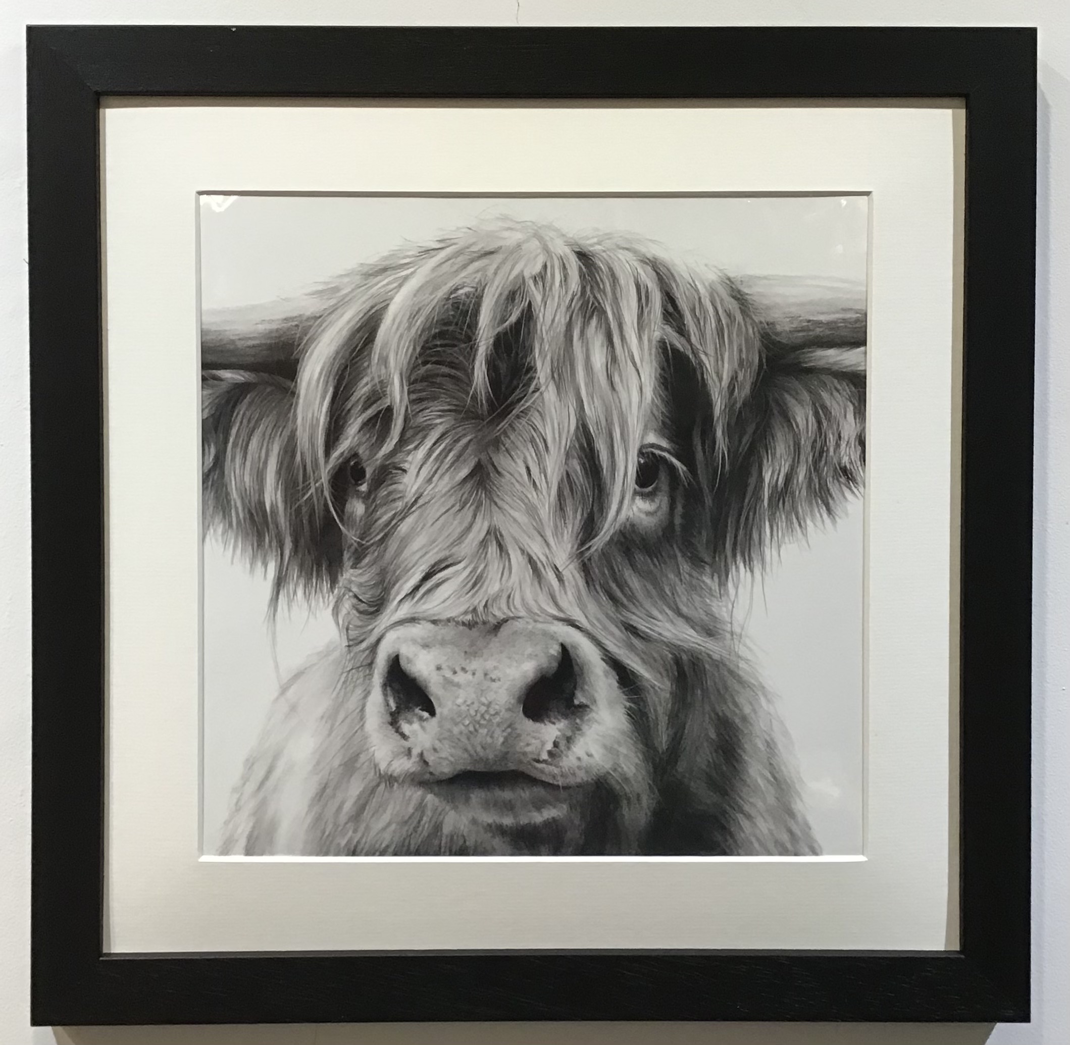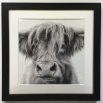 Framed, signed, limited edition “Morag” print, by David Pooley. The frame is a painted black solid wood frame, hand cut and joined. Ready to hang on a wall. Exterior dimensions of the frame: approximately 17.5 inches square, frame thickness approx. 3cm, mount widths approx. 4 – 4.5cm. Each one is given a print number.