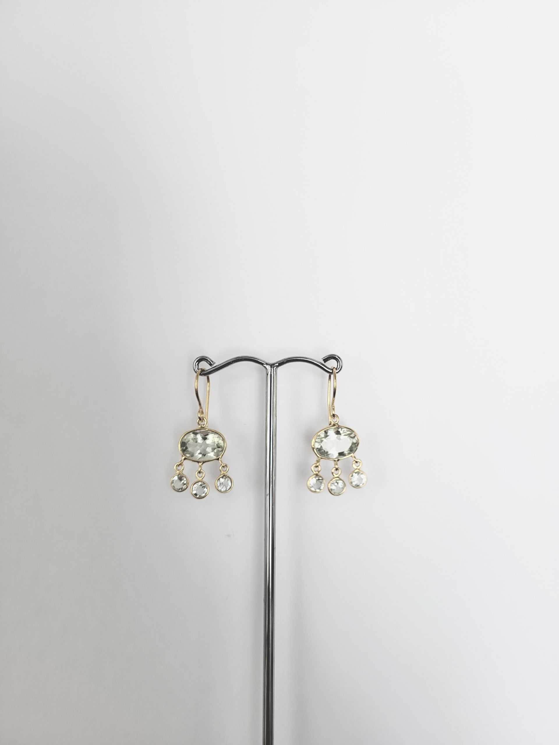 These hook jellyfish style handmade earrings are gold plated sterling silver and are set with faceted green amethyst. Smaller gemstones hang and move gently when worn.