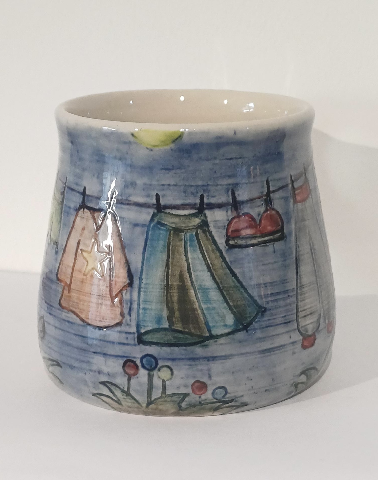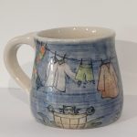 A beautiful, hand thrown stoneware mug with clothes line design. Each piece is a unique work of art, having been thrown, carved and decorated by hand. Approx 9cm tall. Microwave and dishwasher safe but we would recommend washing by hand to prolong the life of this handmade item.