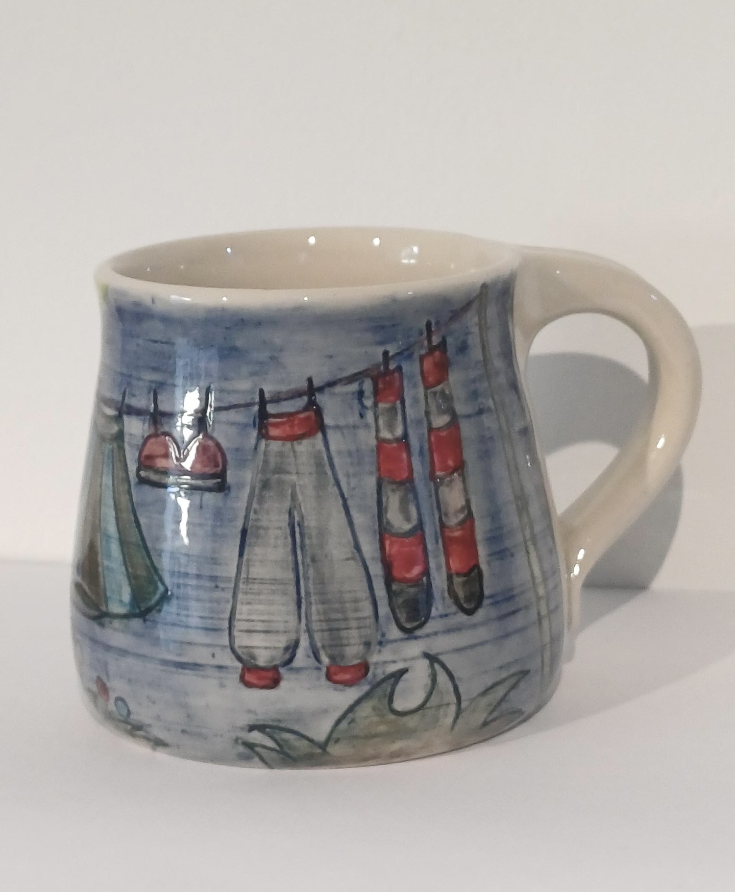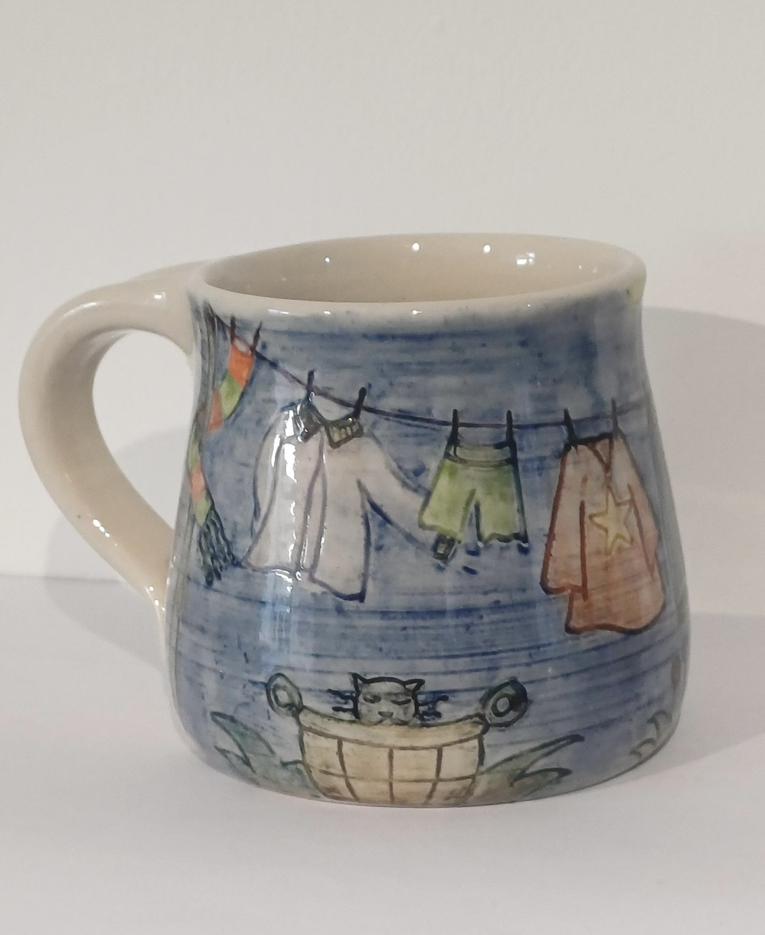 Handmade, carved and decorated stoneware mug with clothes line design
