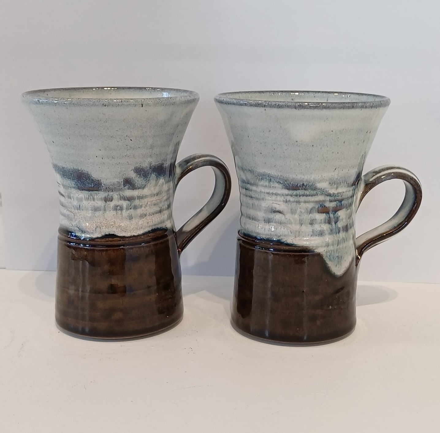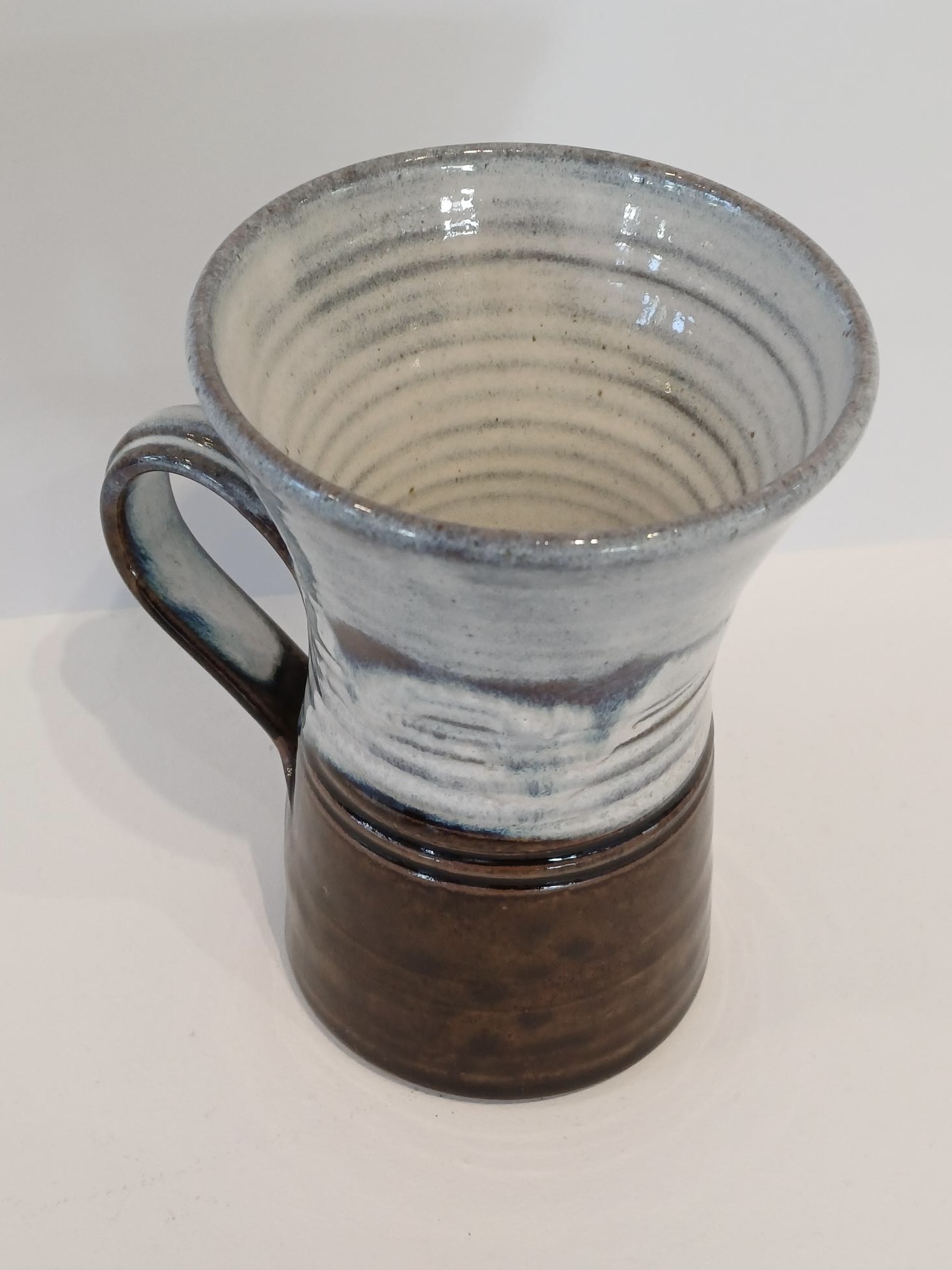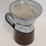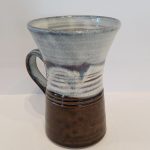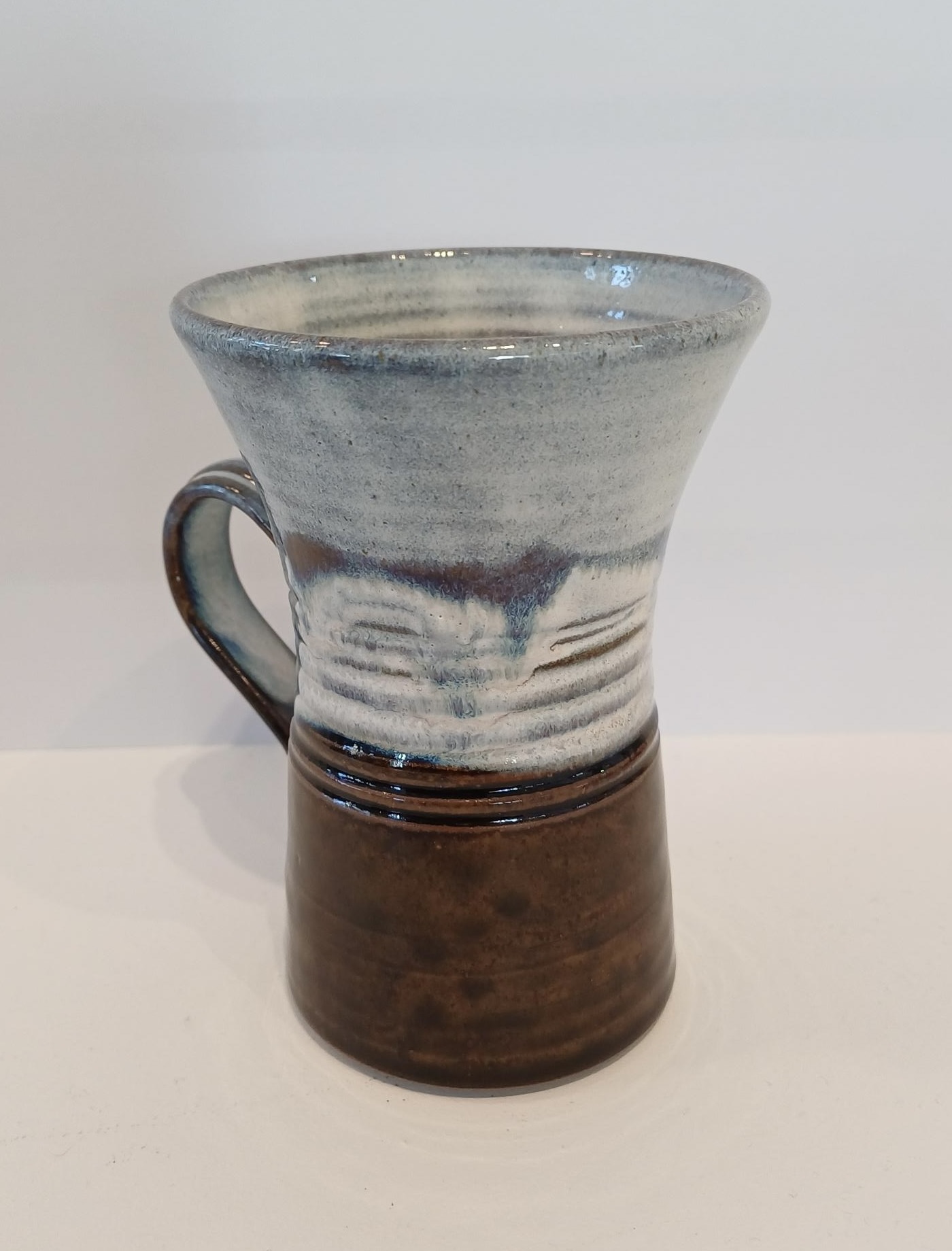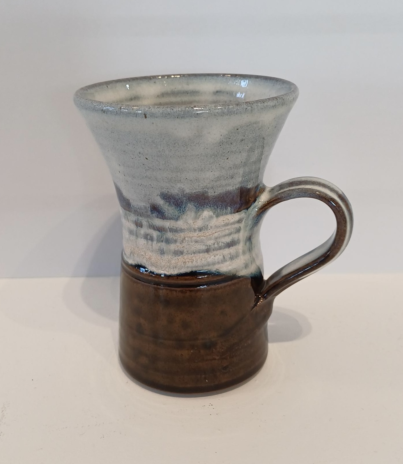 Handmade mug in attractive blue/brown glaze. Approximately 13cm high and 9cm diameter at the rim, with handle. Microwave and dishwasher safe but we would recommend hand washing to preserve the life of this lovely handmade product. This image is illustrative because each item produced is unique and colour variations occur.