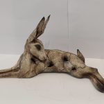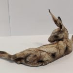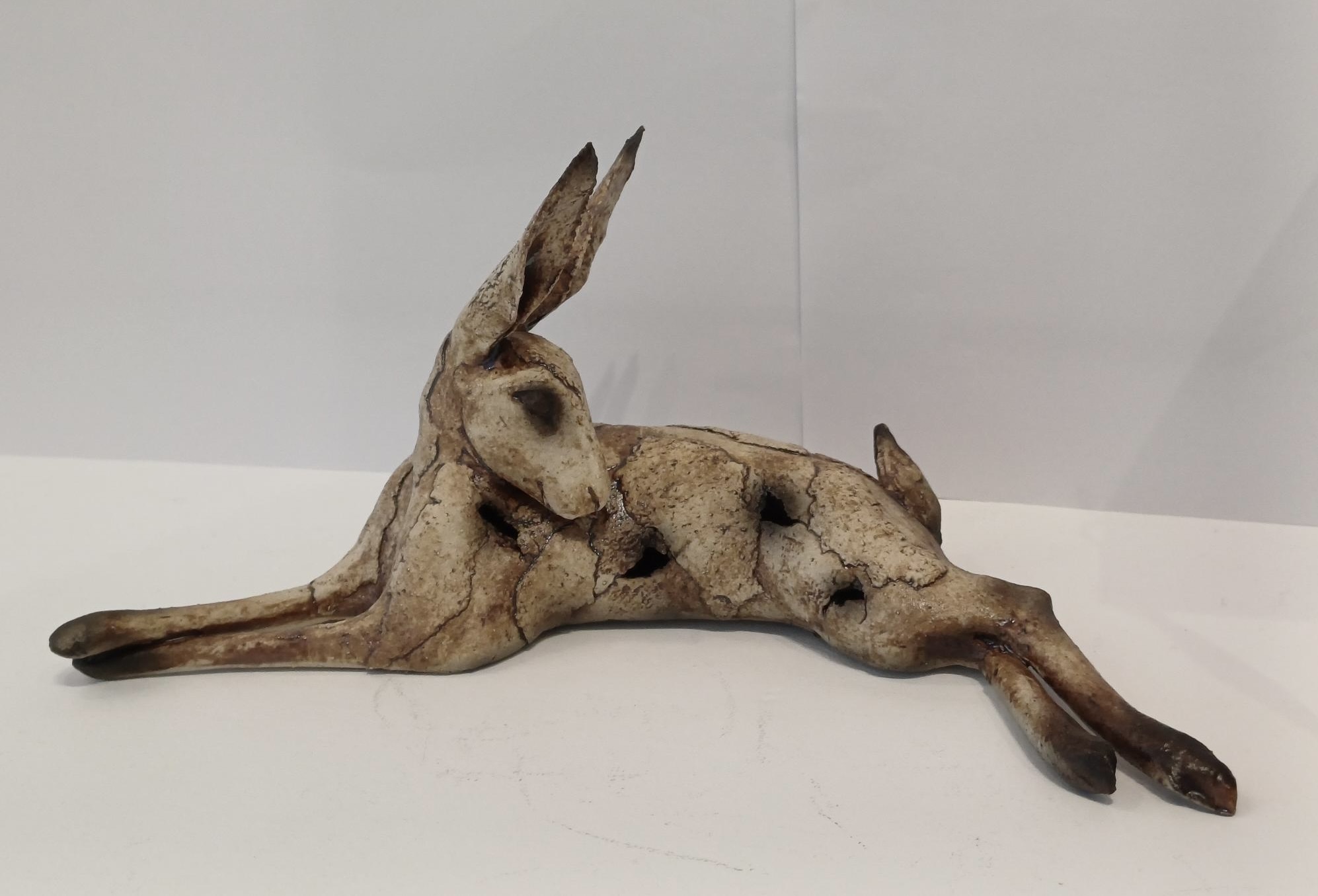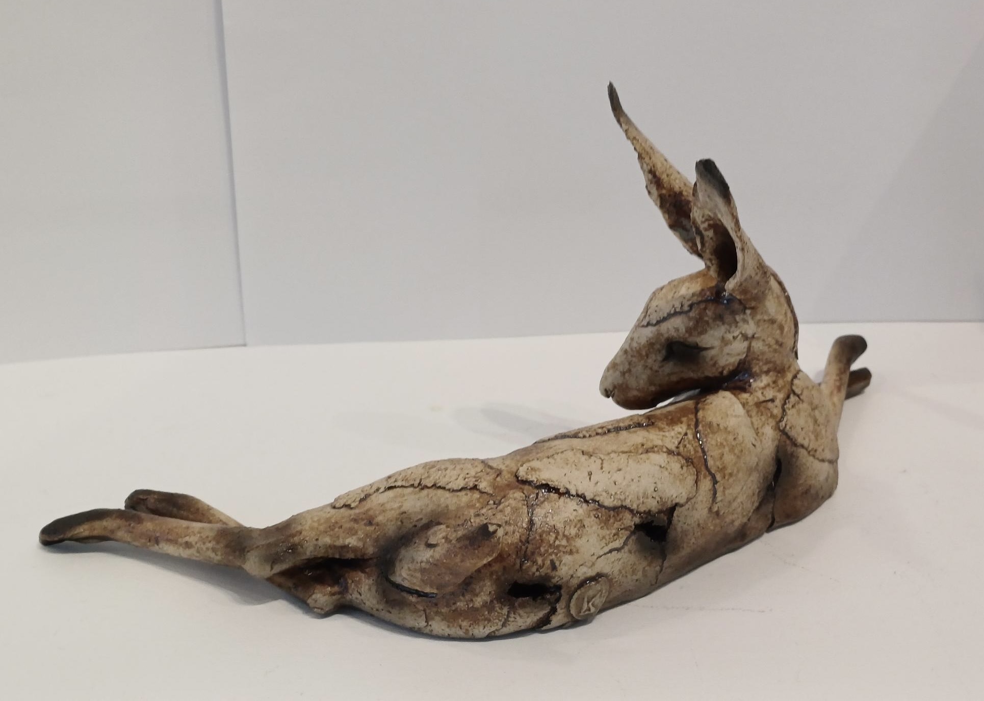 Beautifully handmade stoneware medium hare sculpture lying down with his ears pointing upwards. Dimensions: approximately 12cm tall and 26.5m wide.