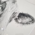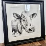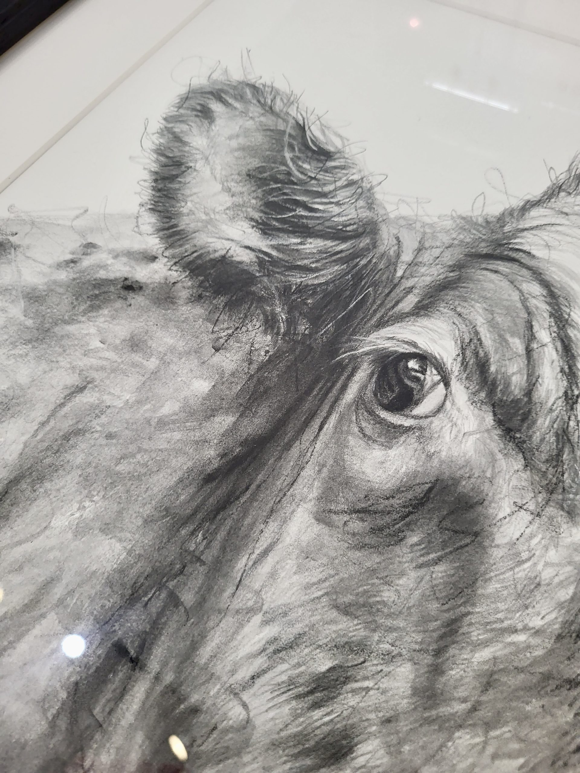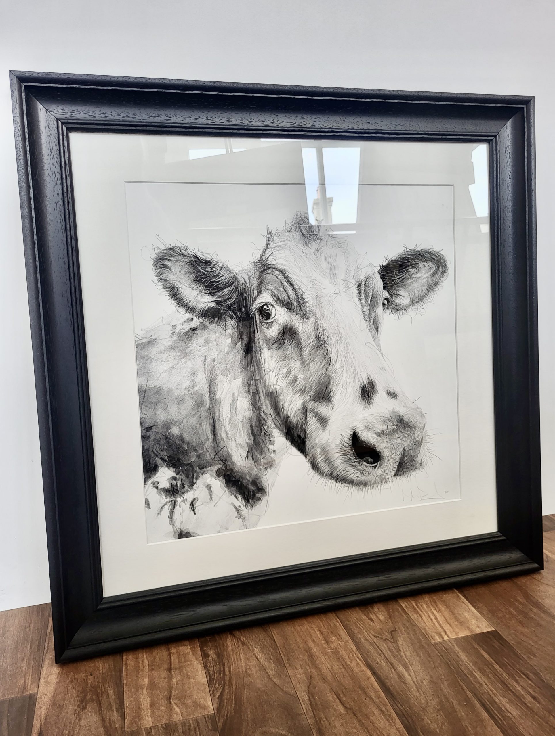 Original charcoal and wash drawing of Josephine the cow, by Cumbrian artist David Pooley. This lovely portrait is full of character and comes mounted, in a high quality, handmade black wooden frame. External dimensions of frame: 61.5 x 61.5cm.  Certificate of authenticity included. Please note that photographs of this artwork may include some glare from the reflections on the glass.