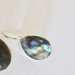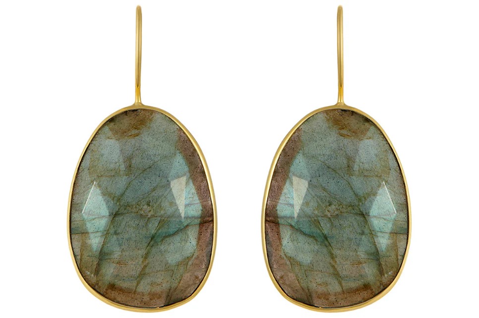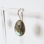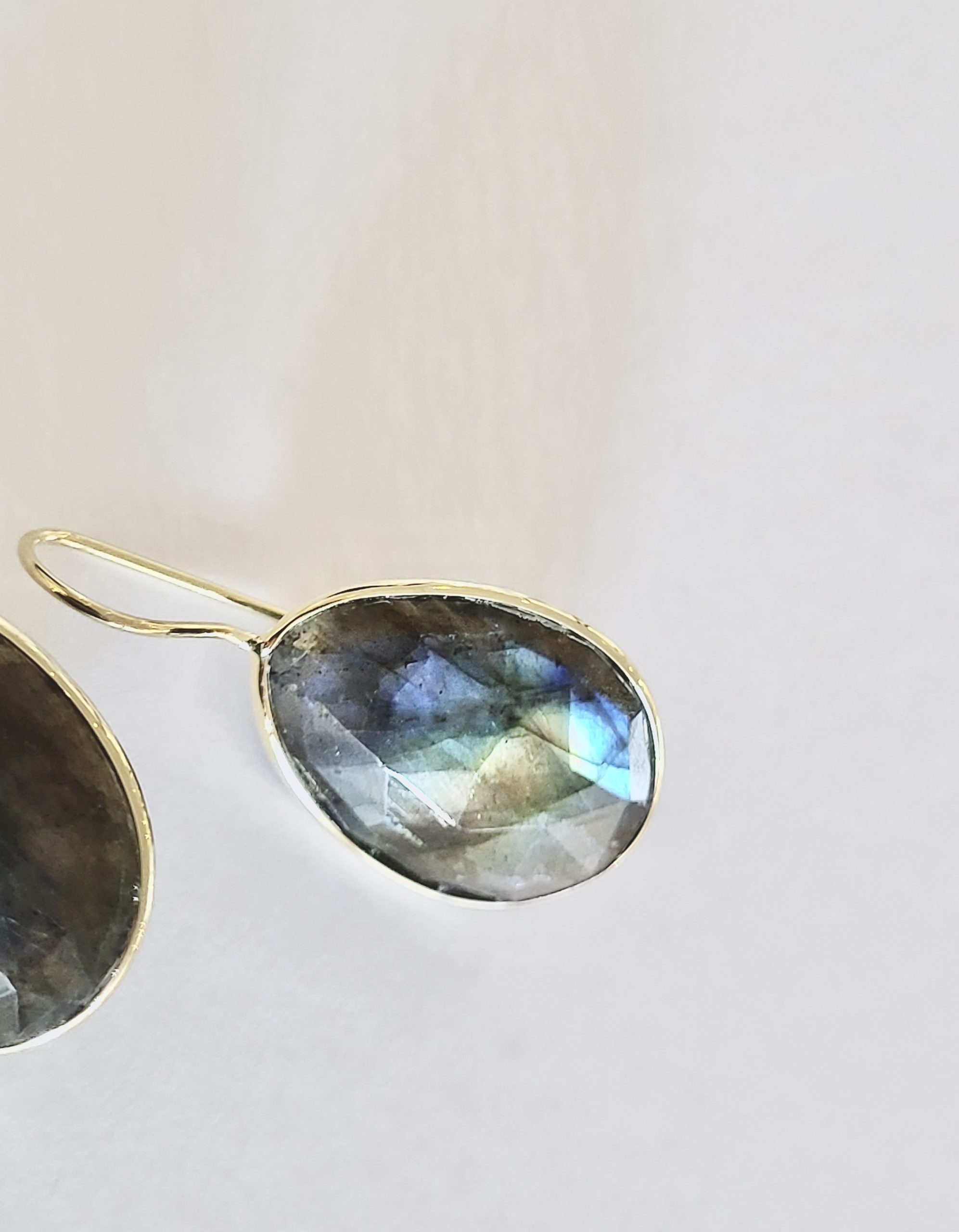 These handmade earrings are gold plated sterling silver with a hook fixture and set with a gorgeous iridescent labradorite pebble. Labradorite is a beautiful gemstone that changes appearance and flashes different shades of blue, green and purple hues depending on where the light shines through it. As the gemstones are organic, they are asymmetric in shape.