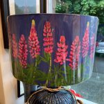 Beautifully handmade lampshade, available in 30cm diameter and 21cm height, or 40cm diameter and 25cm in height, for ceiling or lamps. Please choose the size and orientation you require. Vibrant repeating design of pink Lupins on a deep blue background. The last photo gives an example of what the shade would look like on a lamp.